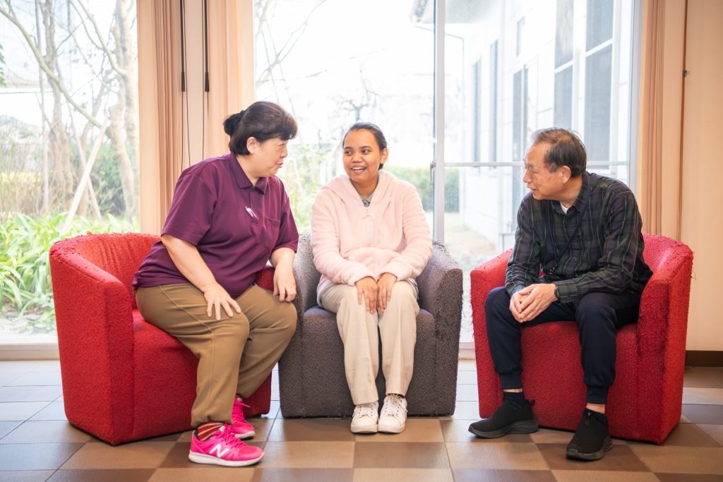 ウィルダさん:日本の仕事の仕方を学ぶために、インドネシアから留学してきました。北九州市は、遊びに行ける場所もたくさんありとても過ごしやすいところです。通っていた学校で施設のパンフレットを見て、「すごく素敵なところだな」と惹かれたことをきっかけに介護の仕事を始めました。パンフレットで感じた印象と変わらないこの施設で、利用者様・スタッフのみなさんと一緒に楽しい毎日を送っています。